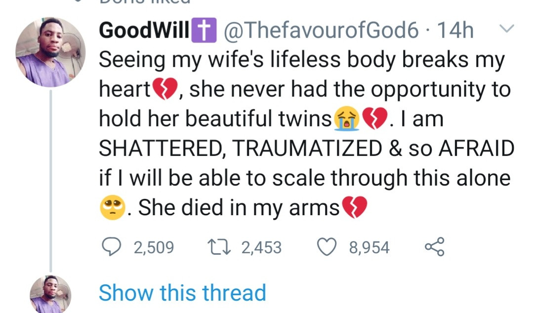 A man is mourning his wife who died in his arms after welcoming twins. He explained that his wife never got to hold their twins before she died. He added that he's shattered and doesn't know if he'll be able to do it alone. He tweeted: "Seeing my wife's lifeless body breaks my heart, she never had the opportunity to hold her beautiful twins. I am SHATTERED, TRAUMATIZED & so AFRAID if I will be able to scale through this alone. She died in my arms." Twitter users have sent him message of support after his tweet went viral.